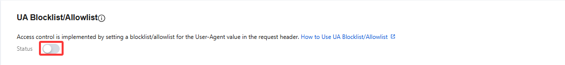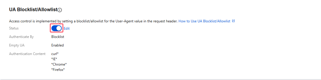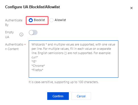 Empty UA | The empty User-Agent function is turned off by default and can be turned on manually. After empty User-Agent is enabled: In the blocklist scenario, requests are allowed if the UA value is empty or the UA field does not exist. In the allowlist scenario, requests are rejected if the UA value is empty, and requests are allowed if the UA field does not exist. |
