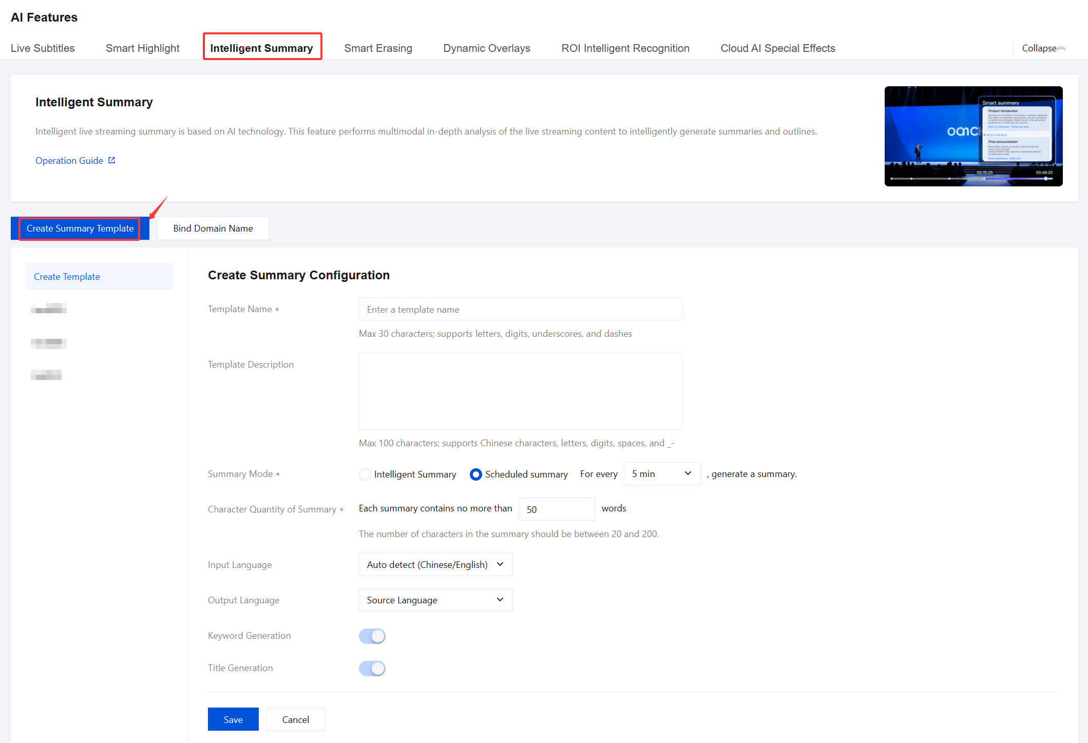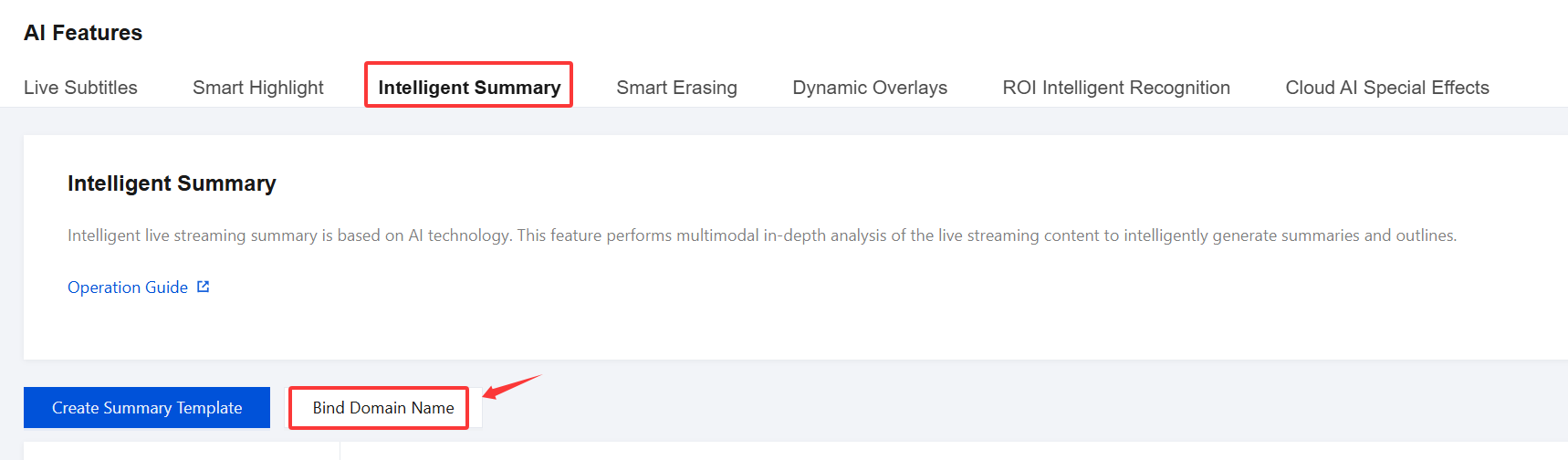 1. Log in to the CSS console. Choose AI Features > Intelligent Summary. 2. Bind a domain name in either of two ways: