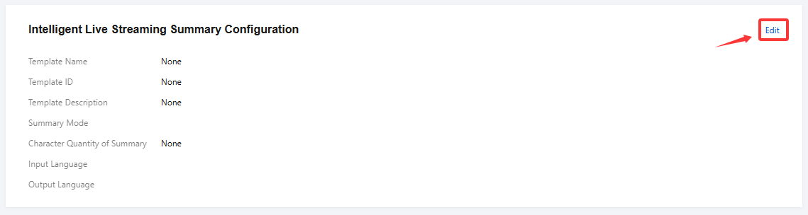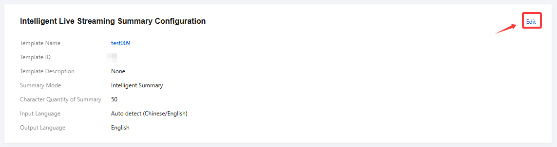 1. Go to Domain Management. Click Domain Name you want to configure or Manage to enter the domain details page. 2. Select the Template Configuration tab and click Edit in the top-right corner of Intelligent Live Streaming Summary Configuration.