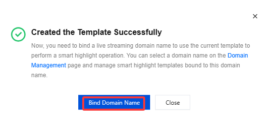Bind a domain name after creating a smart highlight template: After the Smart Highlight Template is successfully created, click Bind Domain Name in the pop-up window. 3. Select a smart highlight template and a push domain (Multiple push domain names can be bound simultaneously) in the domain binding window and then click Confirm.