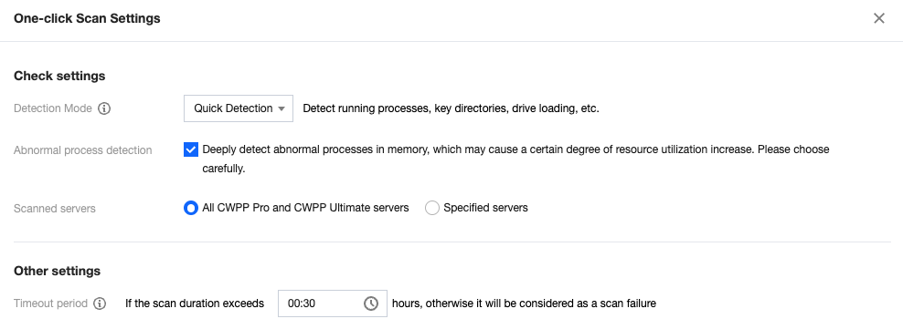 Detection mode: Includes quick detection mode and full-disk detection mode. It can detect running processes, critical directories, and driver loading. The duration of full disk detection is related to the number of server disk files. It is recommended to choose a detection cycle of more than 4 hours to avoid incomplete detections or timeouts.