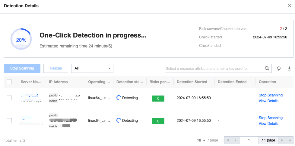 Disable detection: If you want to stop detecting a target server with an under detection status, you can click Stop Scan.