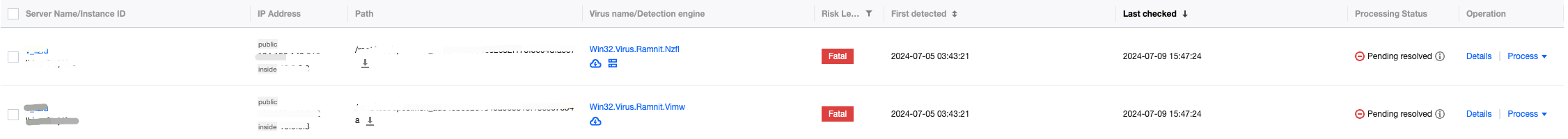 Path: The file path of the target risk file. Click to copy the path information. Click to download the target risk file. Virus name/Detection engine: The name of the virus affecting the target risk file.
