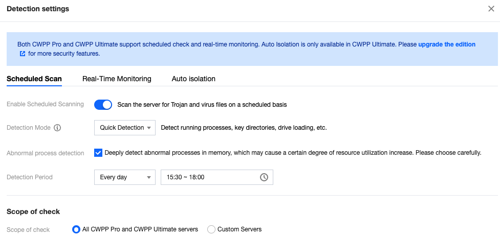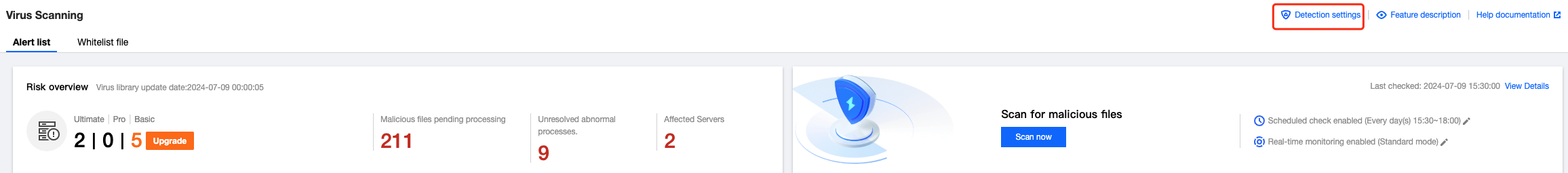 1. Log in to the CWPP console. In the left sidebar, choose Intrusion Detection > File Scanning. 2. On the malicious file scan page, click Detection settings at the top right. A settings page will pop up on the right side where you can configure the detection mode.