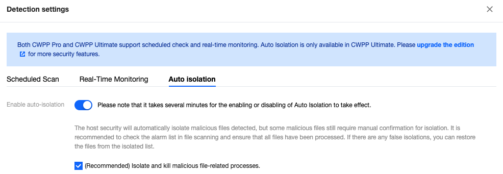 3. On the malicious file detection settings page, you can set scheduled detection, real-time monitoring, and auto isolation.