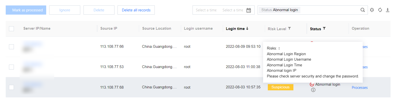 Edit: Re-edit the login source IP, login username, login time, usual login location, covered servers, etc.