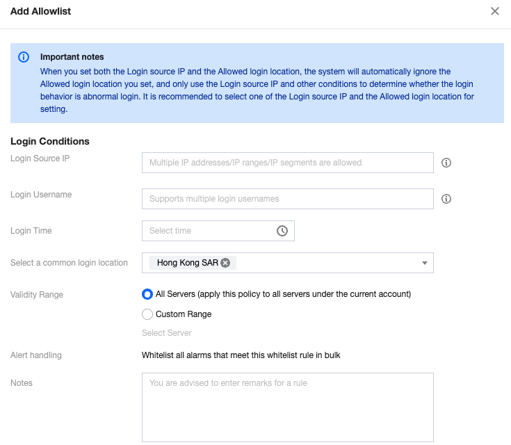 If it is your own log-in behavior and you do not want to see the alarm again, click Processing , and select Add to allowlist to configure common log-in source IP, log-in username, log-in location, log-in time, and effective range.