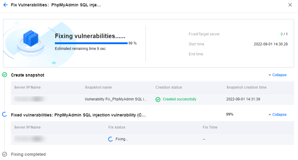 Return to Vulnerability Details to check the server status changes. If vulnerability fixing fails, the status is "Fixing Failed"; if vulnerability fixing is successful, the status changes to "Fixed".