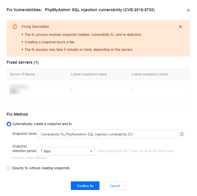 Fix Without Creating Snapshots: If snapshots have been created for all the servers selected for fixing vulnerabilities on the current day, this item becomes optional.