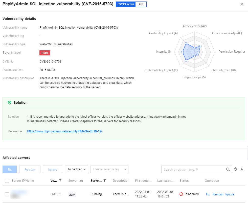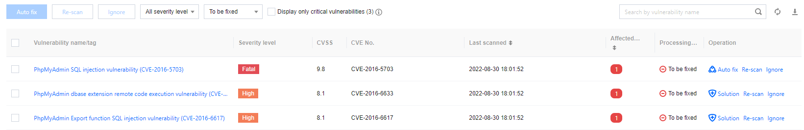Auto-fixing of vulnerabilities may involve executing commands on your servers, which may affect running applications or core system components, and restarting applications or operating systems, which may affect your business continuity. For servers that are used for your core business, we recommend that you take the impact into full consideration when planning which vulnerabilities to fix and in what order to do so.