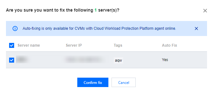 Select the target servers in the affected server list, and click Fix to open the confirmation pop-up window.