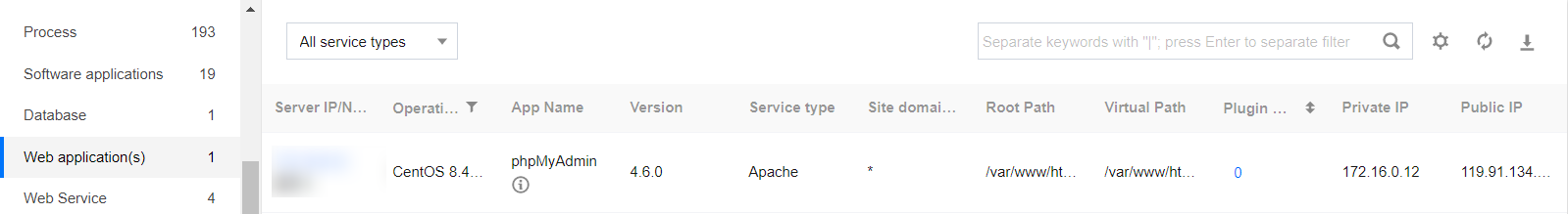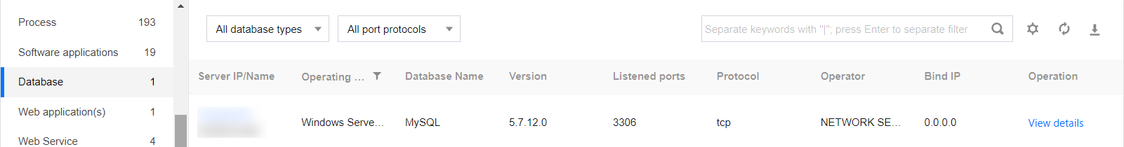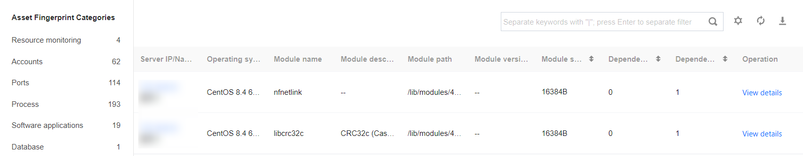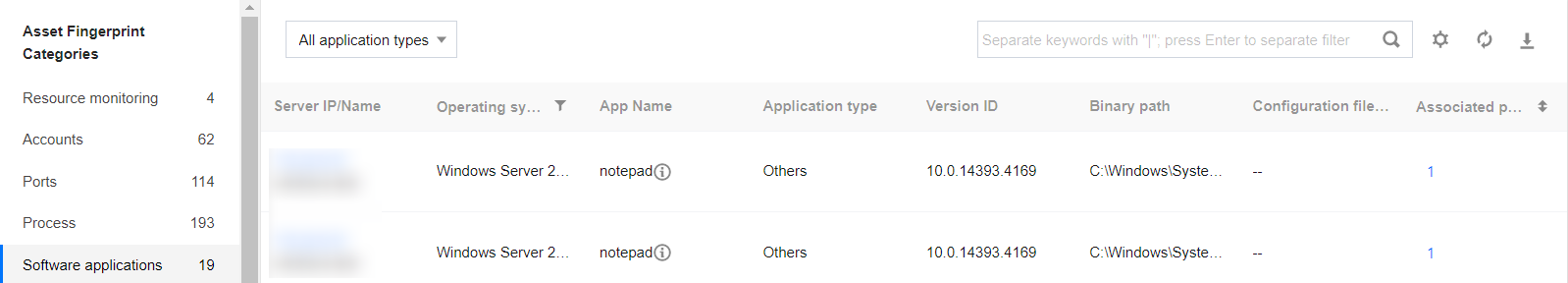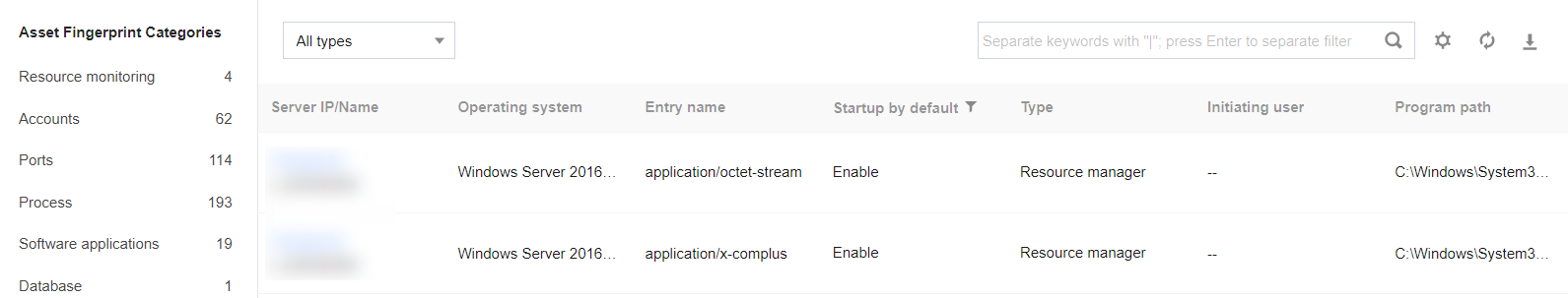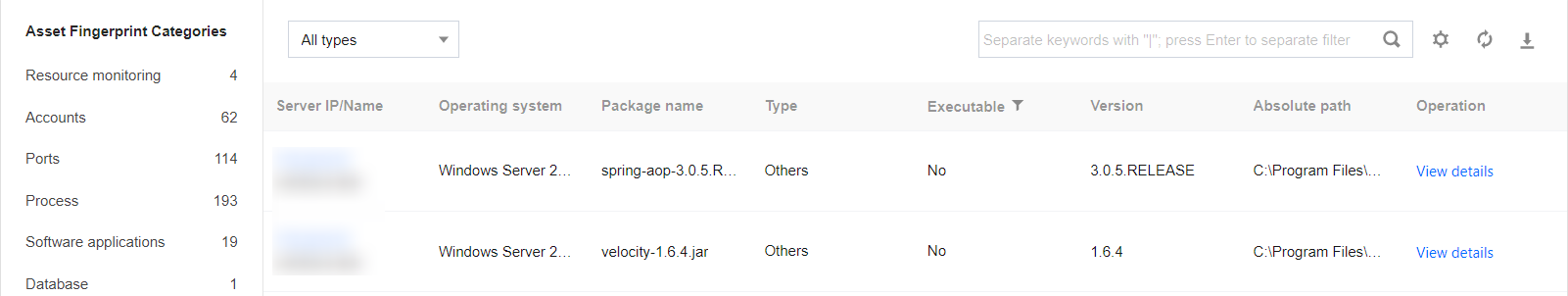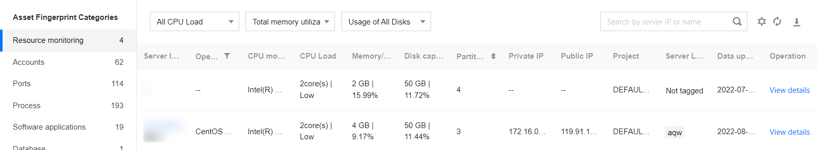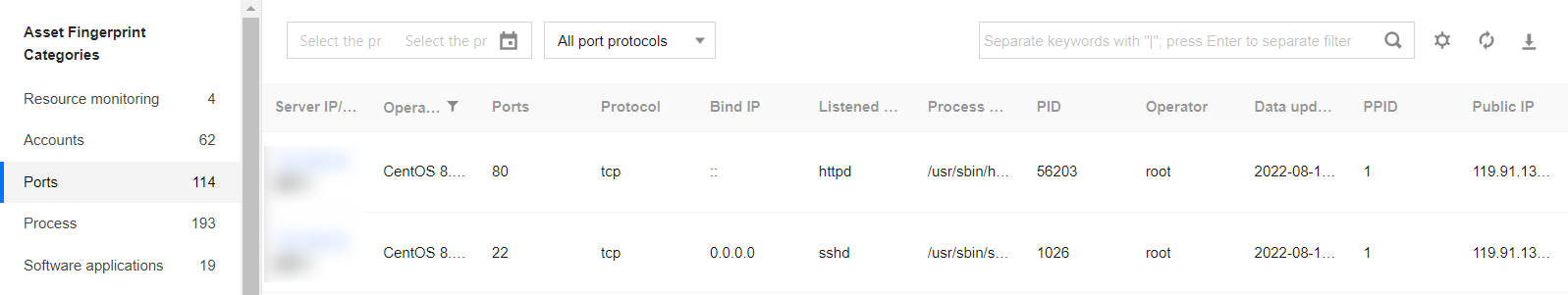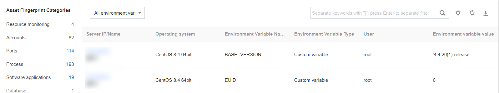 1. Log in to the CWPP console, Click Asset Fingerprints on the left sidebar. 2. The asset fingerprints page displays a list of asset fingerprint classifications, including each asset fingerprint item and its corresponding number of servers. After an item from the asset fingerprint classification list on the left is selected, the details of that fingerprint will be displayed on the right. It supports both query and export of fingerprint data.
