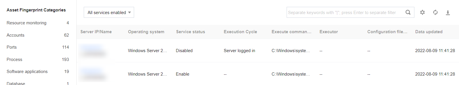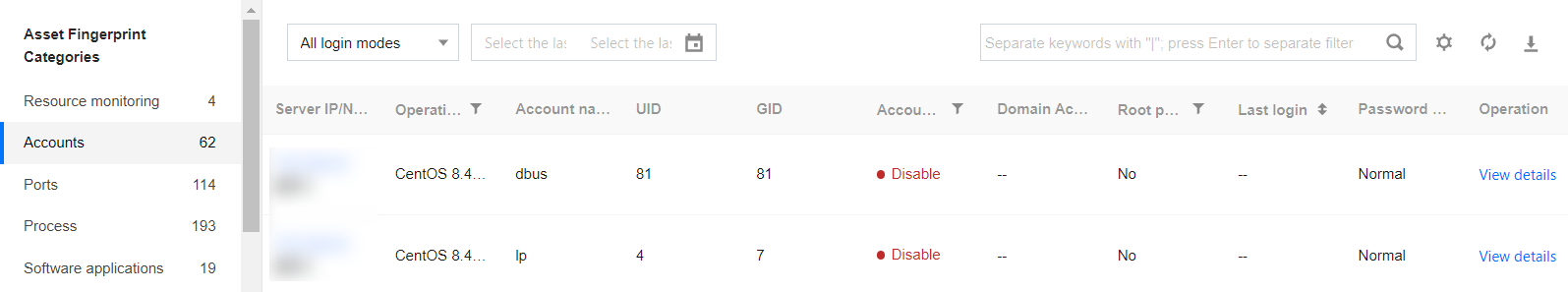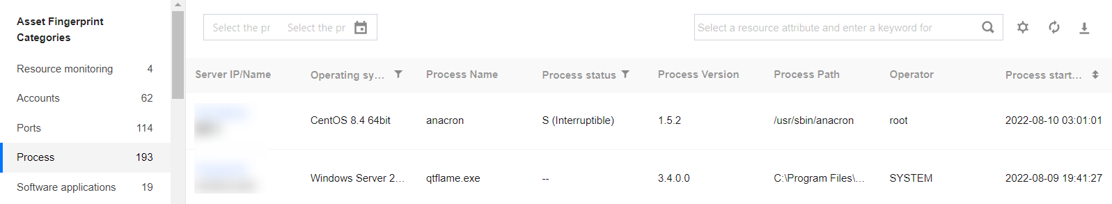 Asset Fingerprints provides detailed asset data including server resource monitoring, accounts, ports, and processes, and gives you a quick overview of assets affected by security events.