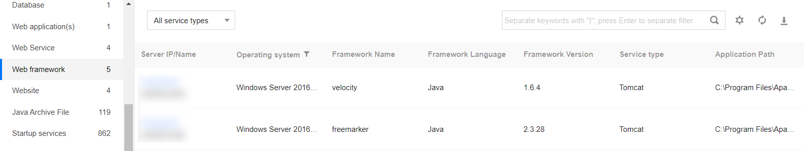 Collects all Web frameworks applied on the server.
