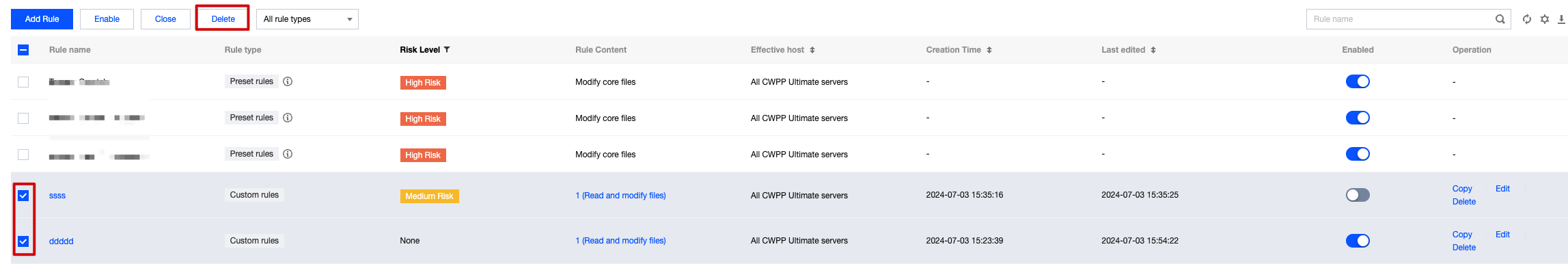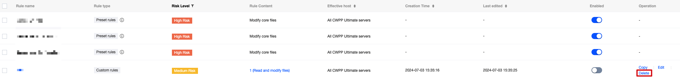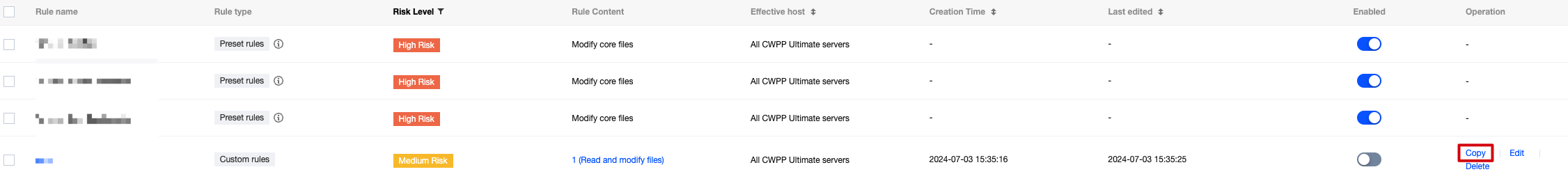 The monitoring rules for core file monitoring are divided into system rules and custom rules. System rules are configurations set by Tencent CWPP operation experts and algorithm experts through multi-model refinement, suitable for most tamper-proof user configuration monitoring requirements. You can also create custom rules based on your business needs. Custom rules support editing, copying, and deleting.