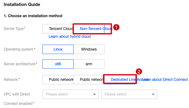1. Log in to the CWPP console. In the left sidebar, click Server List > Install Cloud Workload Protection agent, and view the installation guide details in the pop-up window on the right. 2. In the installation guide, for server type, click to select Non-Tencent Cloud, and for network, click to select Dedicated Line Access.