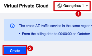 1. If you do not have a VPC network in the South China (Guangzhou), North China (Beijing), East China (Shanghai), East China (Shanghai Finance), East China (Nanjing), and Southwest China (Chengdu) regions, log in to the VPC console, and click VPC to enter the VPC page. 2. On the VPC page, click the drop-down box to select the required region, and click Create to pop up the create VPC window.