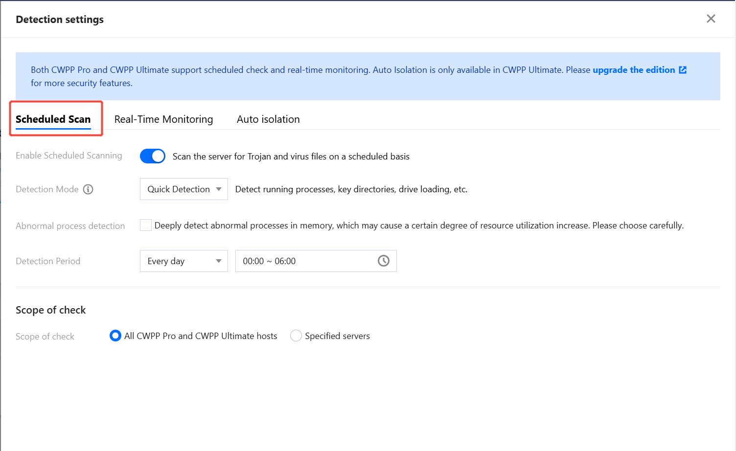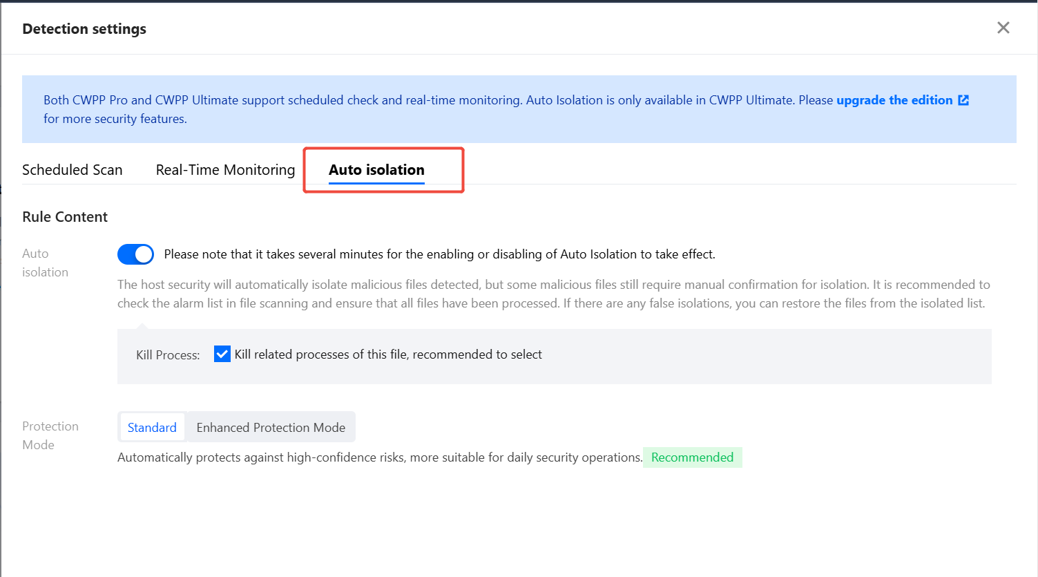 6. On the virus scanning page, click Detection Settings in the upper right corner. It is recommended to enable the auto-isolation switch. If a malicious file is detected, it will be automatically isolate immediately.