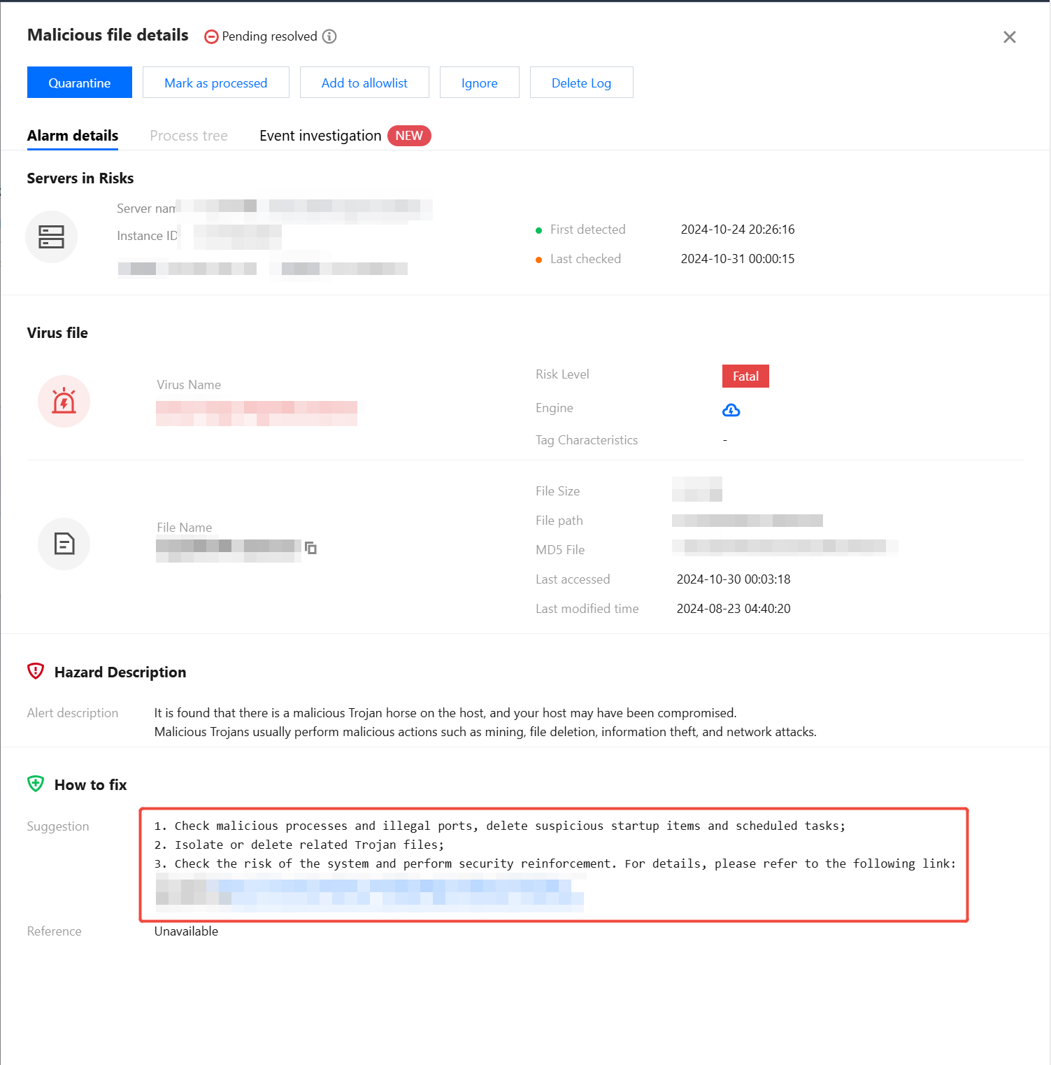 - Log in to the host, find the corresponding file, manually delete or quarantine it and end related processes. Then mark the alarm as processed on the console. The alarm handling status will become "Resolved".
