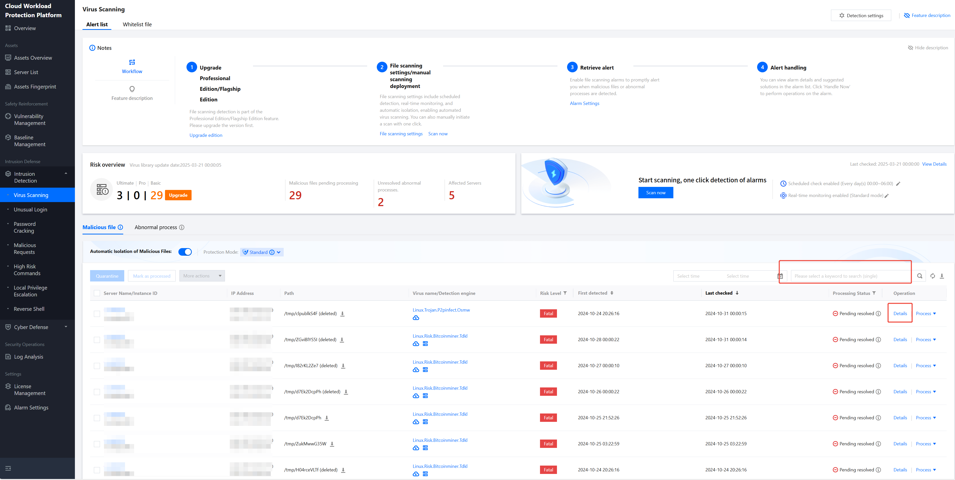 1. Log in to the CWPP Console. In the left sidebar, select Intrusion Detection >Virus Scanning. 2. On the virus scanning page, search by Instance ID, locate the specific alarm and click details.