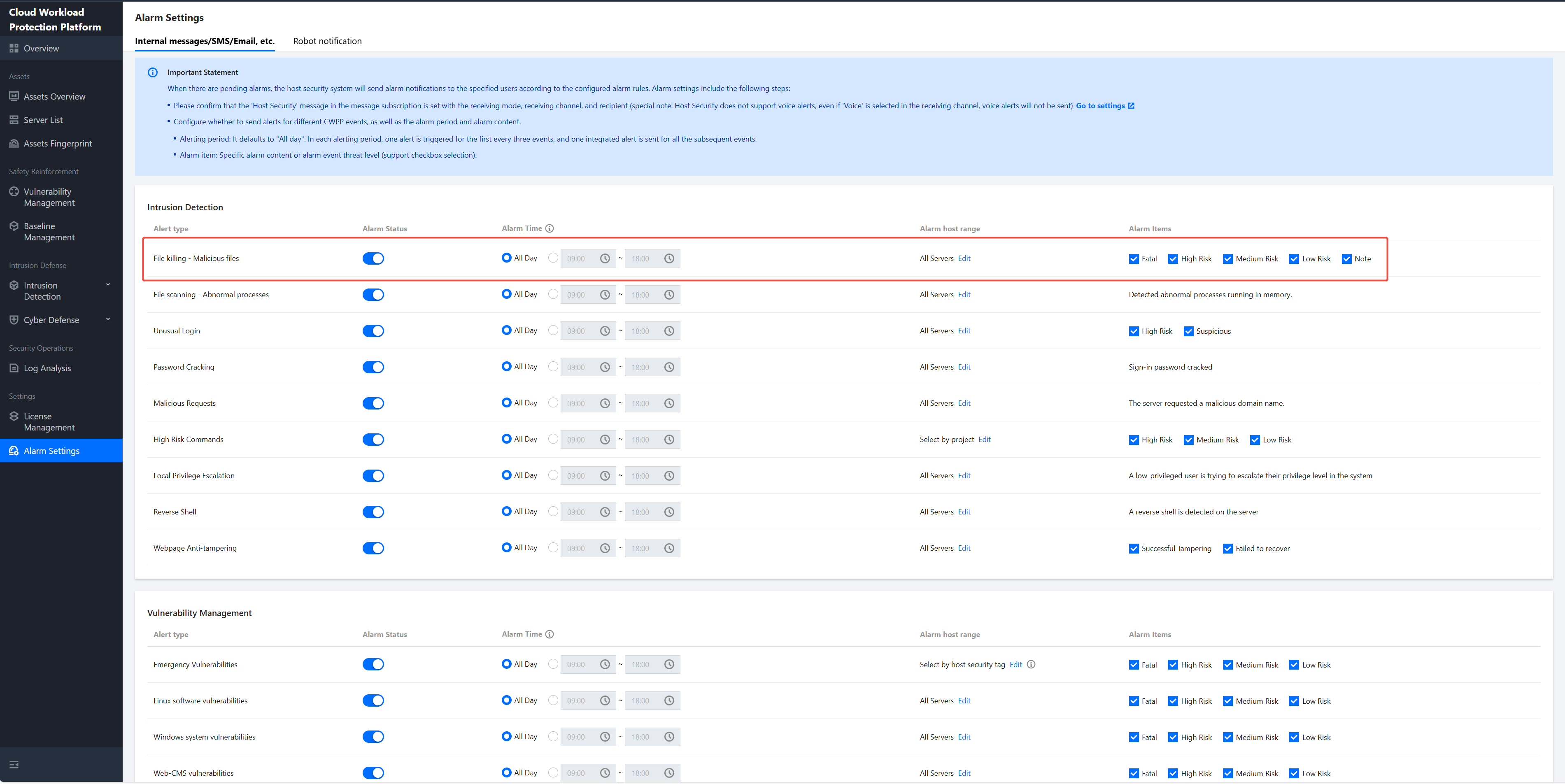 On the Alarm Settings Page, configure the alarm time, alarm host range, and alarm items for file killing - malicious files. How to Set Up Regular Inspection for Malicious Files?