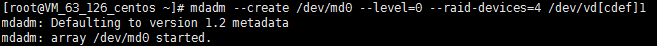 mdadm --create /dev/md0 --level=0 --raid-devices=4 /dev/vd[cdef]1