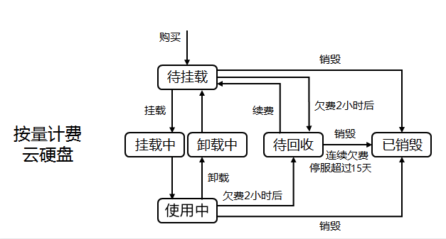 待挂载 | 稳定状态 | 云硬盘创建成功后,被挂载到云服务器之前的状态。 |