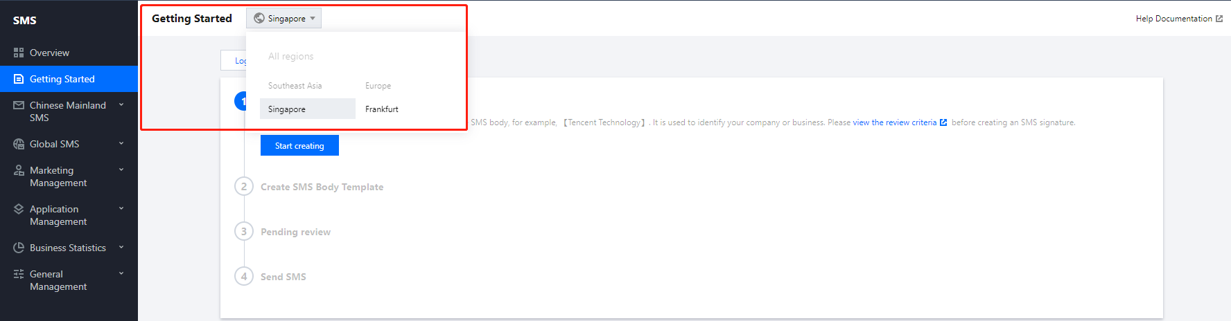 1. SMS signatures and templates for each region need to be separately created, but they can be copied across regions. Before sending an SMS message, make sure the region selected for the SMS application is the same as that selected for signature and template creation.