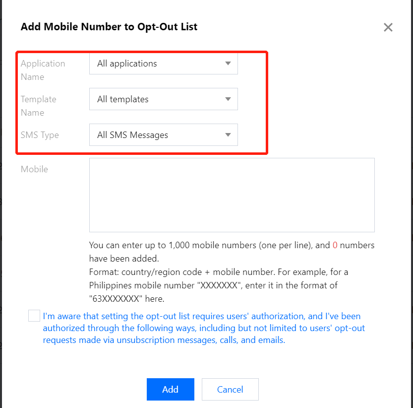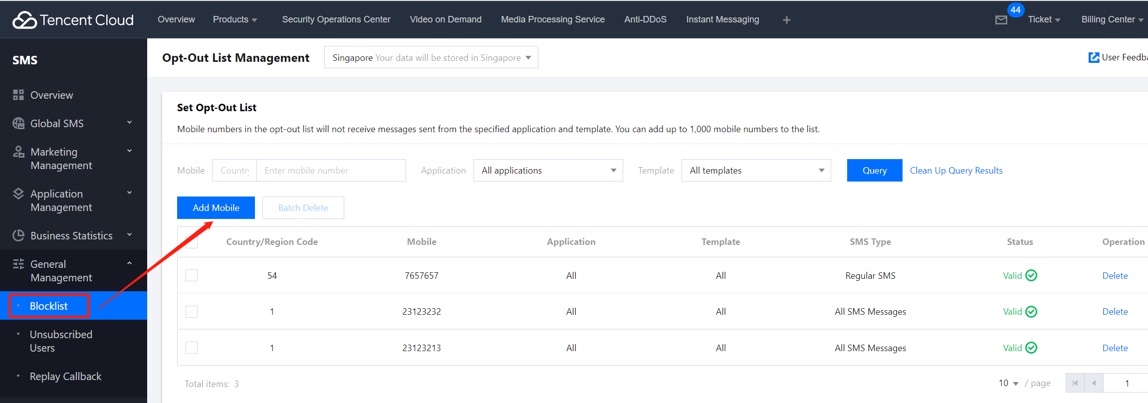The Do Not Disturb List feature provides proactive anti-harassment capabilities. You can add phone numbers to the Do Not Disturb List, and phone numbers in the list will not receive SMS messages sent using the corresponding signature. The total number of Do Not Disturb List numbers configured in all signatures cannot exceed 1,000.