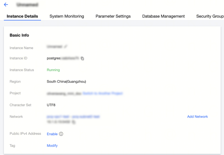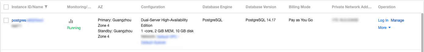 After a TencentDB for PostgreSQL instance is created, click its ID in the instance list or click Manage in the Operation column to enter the instance management page, where you can view its details, monitor it, and manage its databases. Instance details