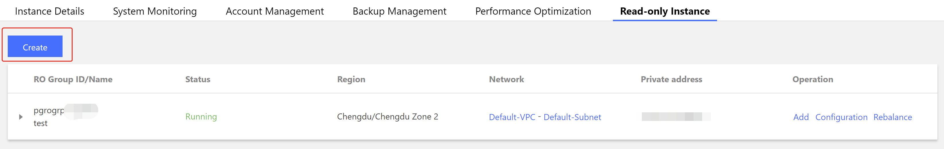 1. Log in to the TencentDB for PostgreSQL console. In the instance list, click an Instance ID or Manage in the Operation column to enter the instance management page. 2. Click Add Read-Only Instance in the Instance Architecture Diagram section on the Instance Details tab or click Create on the Read-only Instance tab.