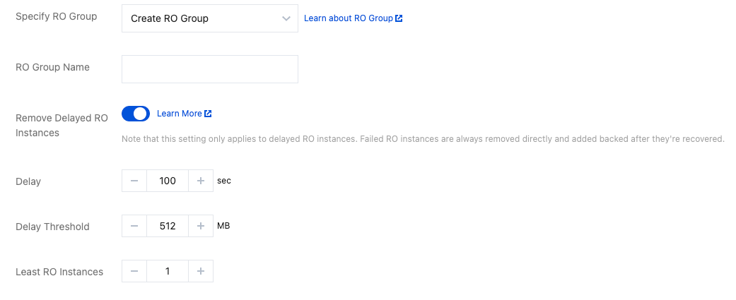 Specify RO Group: Select Create RO Group. If multiple read-only instances are purchased at a time, all of them will be assigned to the newly created RO group. The RO group automatically allocates read weights to each read-only instance and automatically distributes read requests among them based on their read weights.