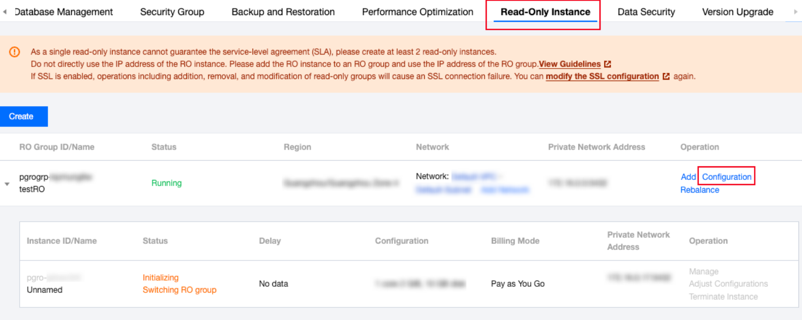 2. On the instance management page, click the Read-Only Instance tab and click Configuration in the Operation column to enter the RO group configuration page.