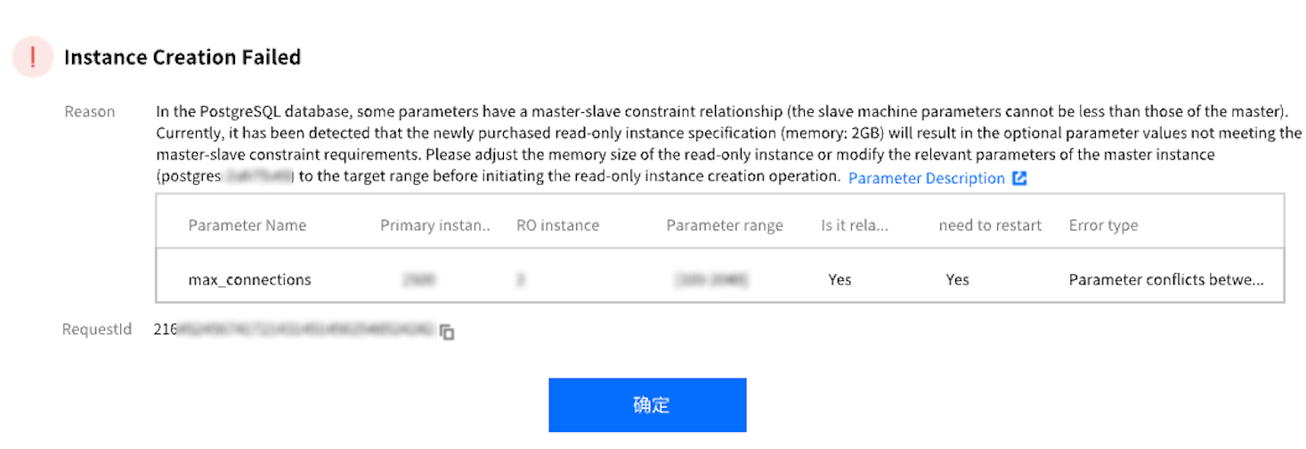 When a read-only instance is associated with the primary instance of a PostgreSQL database, certain parameters on the read-only instance must be set to values equal to or greater than those on the primary node. Otherwise, the read-only instance will fail to start properly. For example, parameters such as `max_connections`, `max_worker_processes`, and `max_wal_senders`. During the creation of a read-only instance, if the selected specifications cannot meet the requirement that the parameter values of the read-only instance are equal to or greater than those of the primary instance, a corresponding prompt will be displayed, as shown in the figure below:
