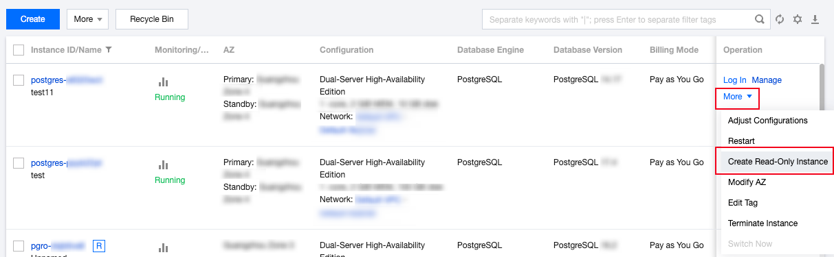 You have created a primary instance. For more information, see Purchase Methods. You have created a read-only instance. For more information, see Overview. 1. Log in to the TencentDB for PostgreSQL console. In the instance list, click More > Create Read-Only Instance in the Operation column of the target instance to enter the instance purchase page. Note:
