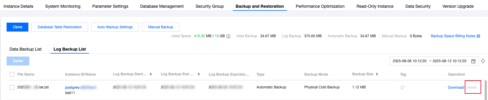 2. Navigate to the Backup and Restoration page, and in the Data Backup List or Log Backup List, locate the Operation column and click Delete.