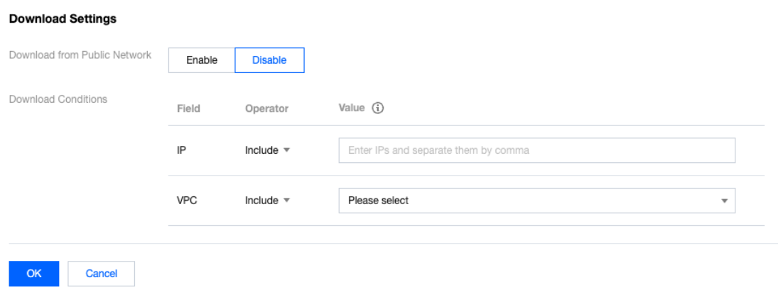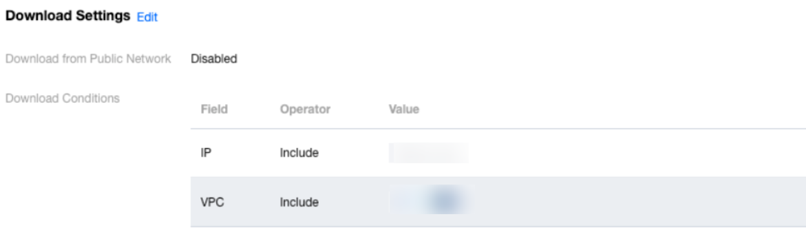 Disabled: You can set the download rules by allowing or blocking specific IPs and VPCs.