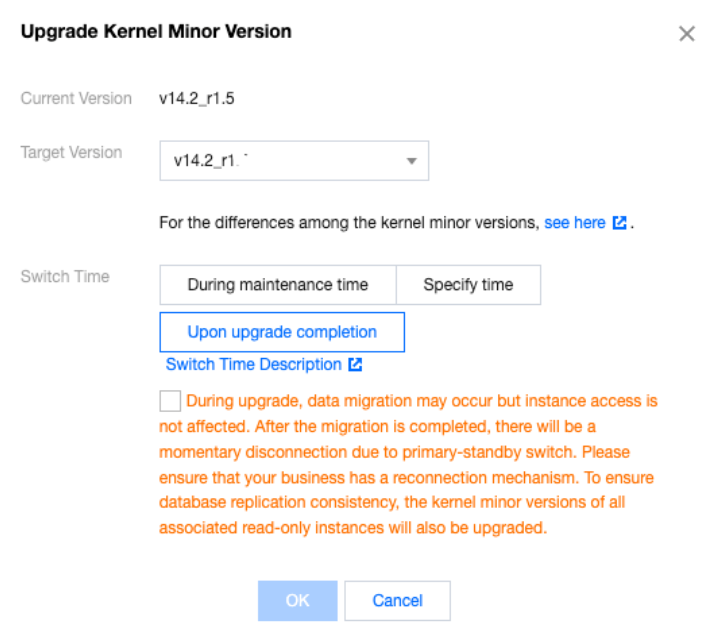 As database kernel minor version upgrade may involve data migration, a momentary disconnection from the database may occur after the upgrade is completed. We recommend that you set the switch time to During maintenance time, so that the switch will be initiated within the next maintenance time after the upgrade is completed.