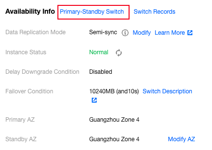 The system automatically initiates a master/slave switch when it detects that the instance is abnormal and cannot be used normally. For specific switch conditions, see Failover Description. Manual Switch