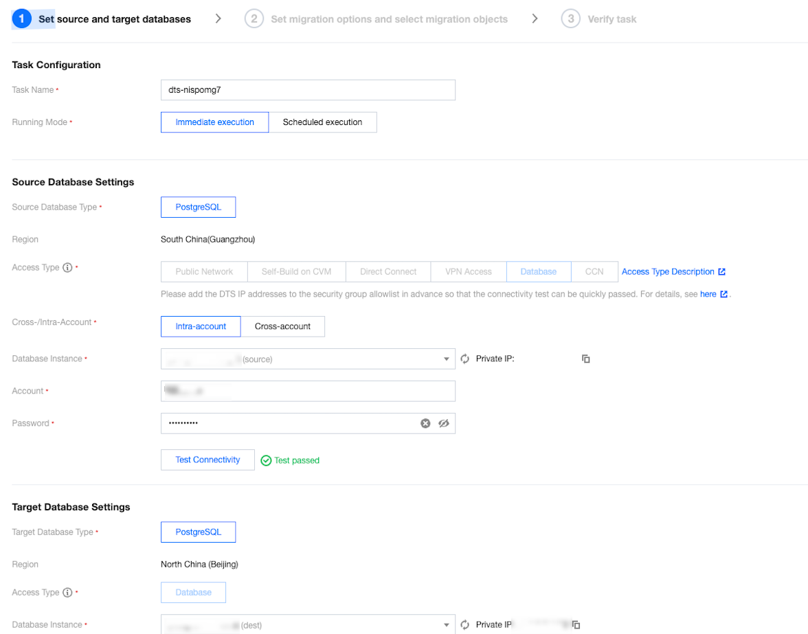 1. Log in to the TencentDB for PostgreSQL console, and click Create. Purchase two TencentDB for PostgreSQL instances A and B. In this documentation, Instance A serves as the source instance, while Instance B acts as the target instance. 3. In the Data Migration Console, click Create Data Migration Task and select the appropriate parameters. Set both the source and target instance types to PostgreSQL.