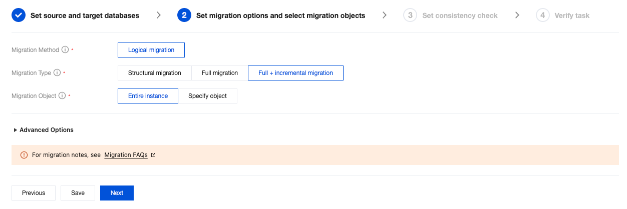 5. Set Migration Type to Full + incremental migration, and Migration Object to Entire instance.