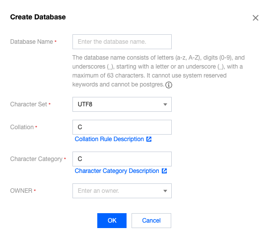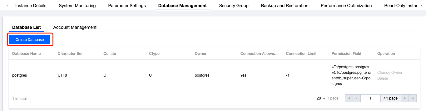 Log in to the Cloud Database PostgreSQL Console, click Instance ID or the Operation column's Manage to enter the instance details page. Click Database Management > Database List> Create Database to create a database. The details are as follows: Note: