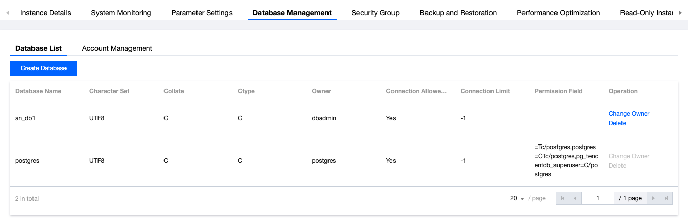Click Instance ID or the Operation column's Manage to enter the instance details page. Click Database Management to view the database list. In the Operation column, click Change Owner to modify the database owner. The details are as follows:
