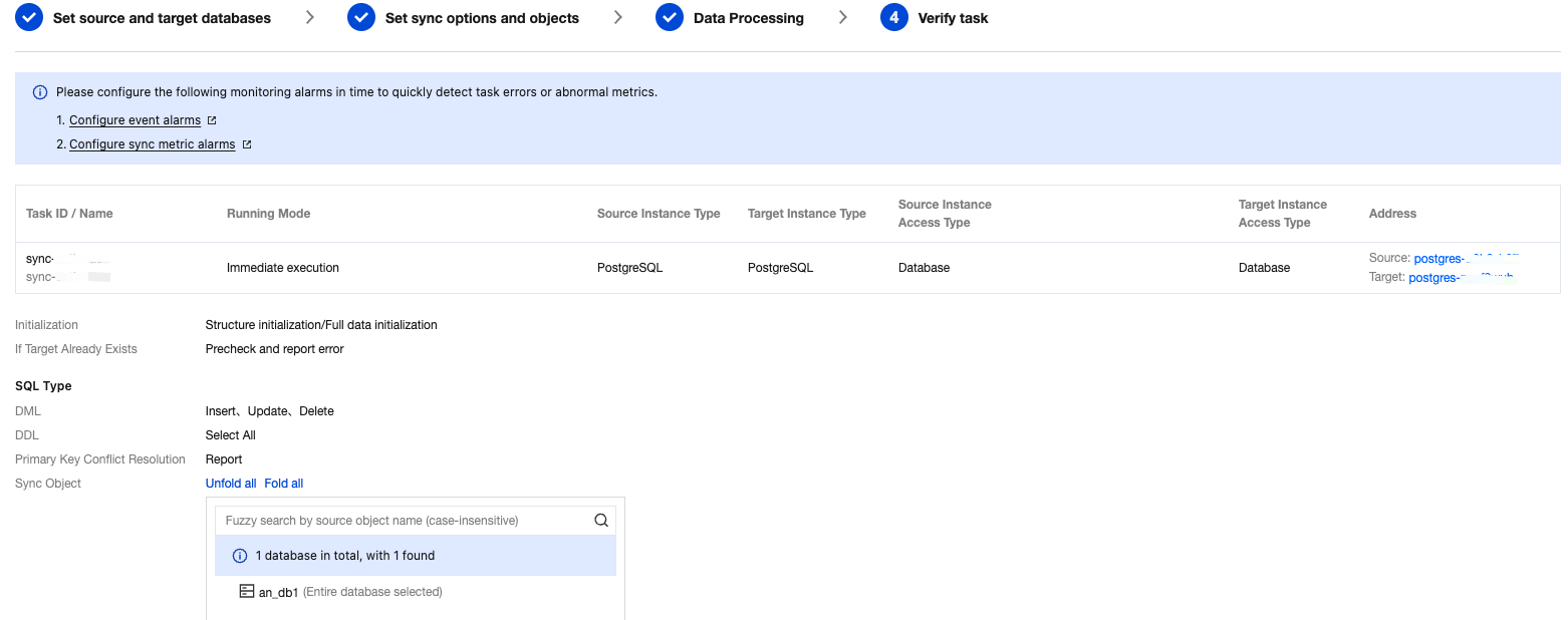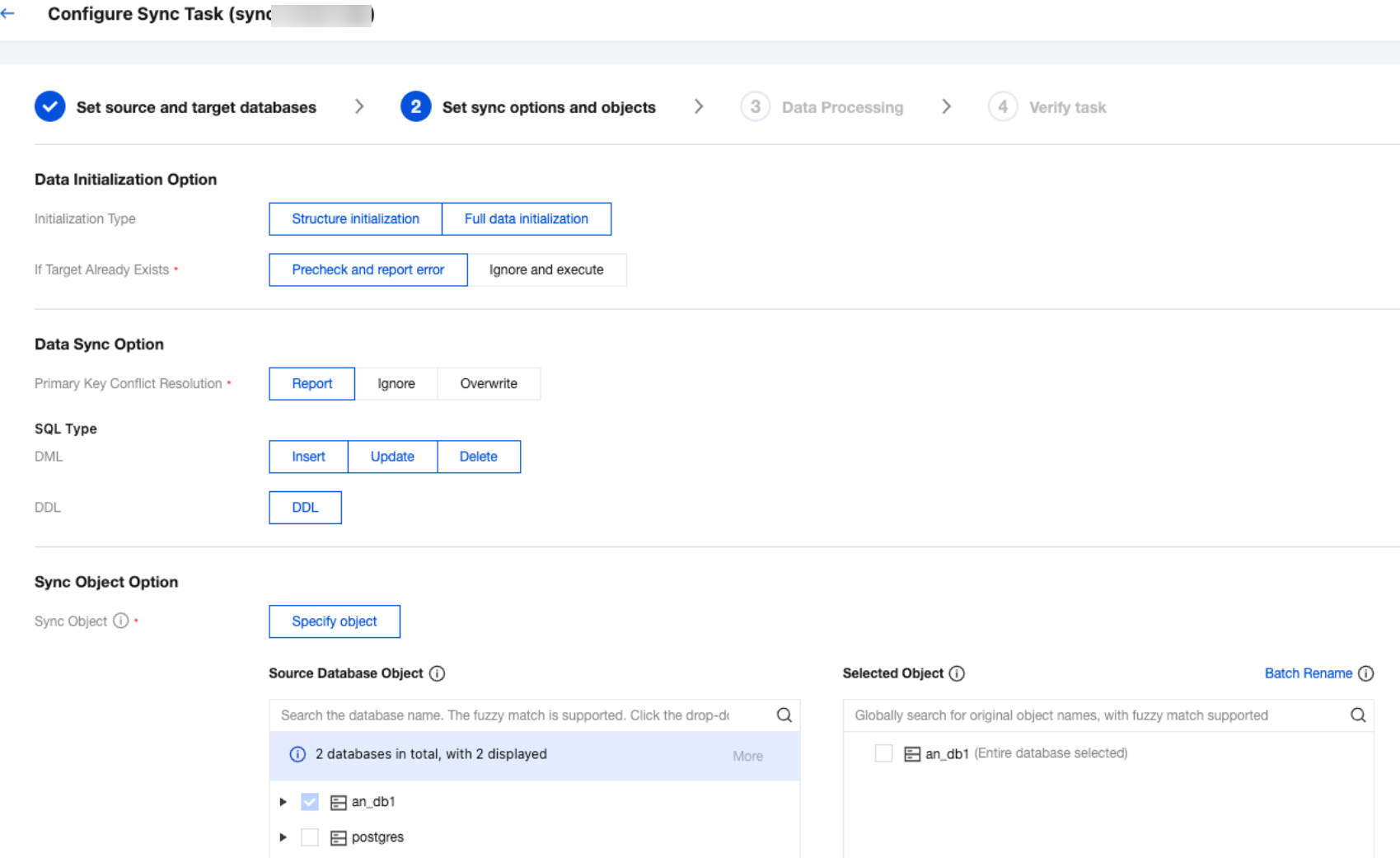 Synchronization object options | Source instance database and table objects | Select objects to be synchronized. Basic tables and views are supported. Only SEQUENCE is supported for advanced objects. |