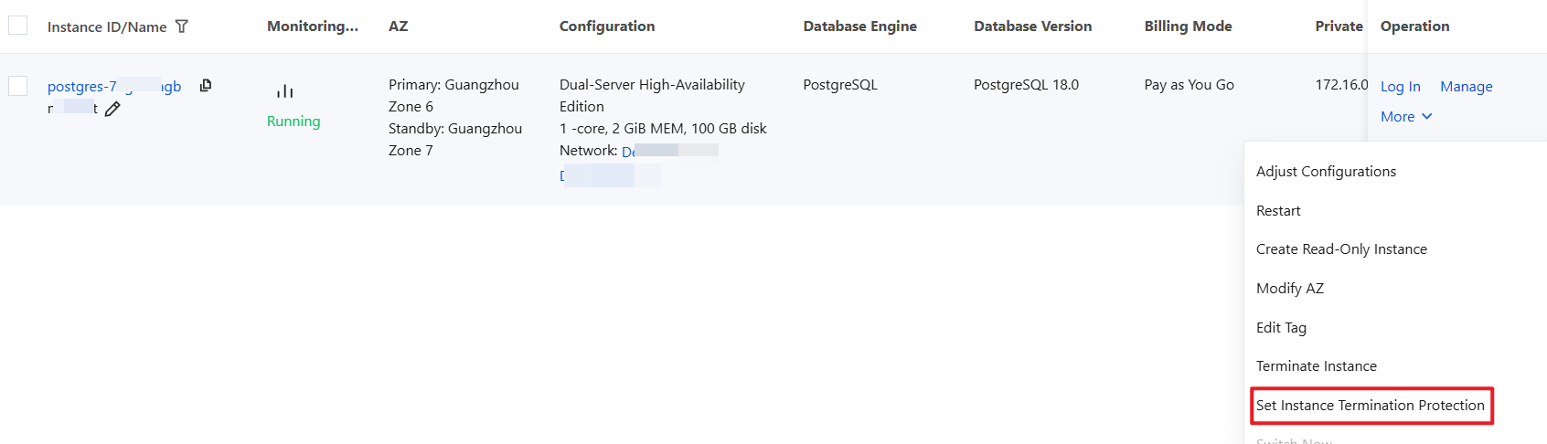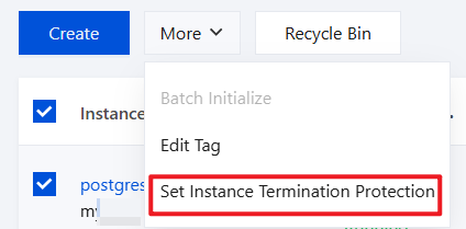 List View: Locate the instance for which you want to enable termination protection in the instance list. In the Operation column, choose More > Set Instance Termination Protection.