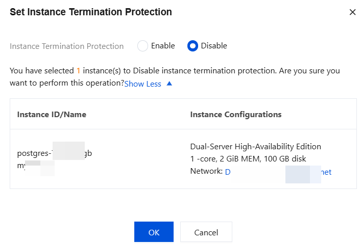 3. In the pop-up Set Instance Termination Protection window, select Disable, then click OK to disable instance termination protection.