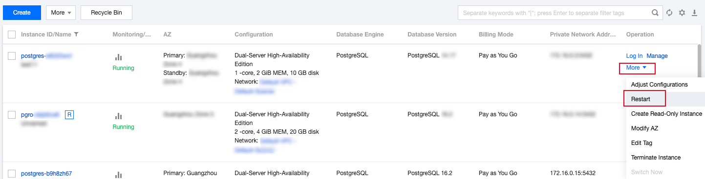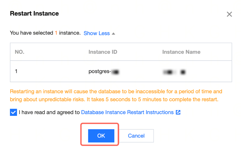 There is a chance of failure in restarting a database. If it takes more than 10 minutes to restart, you can submit a ticket for help. 2. In the pop-up dialog box, indicate your consent and click OK.
