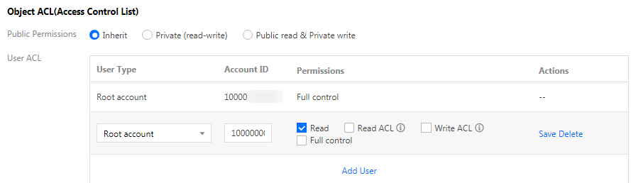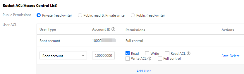 When a bucket or object is created, the root account to which the bucket or object's resources belong has full access to these resources, and the access cannot be modified or deleted. You can use ACLs to grant other Tencent Cloud accounts the access permissions.