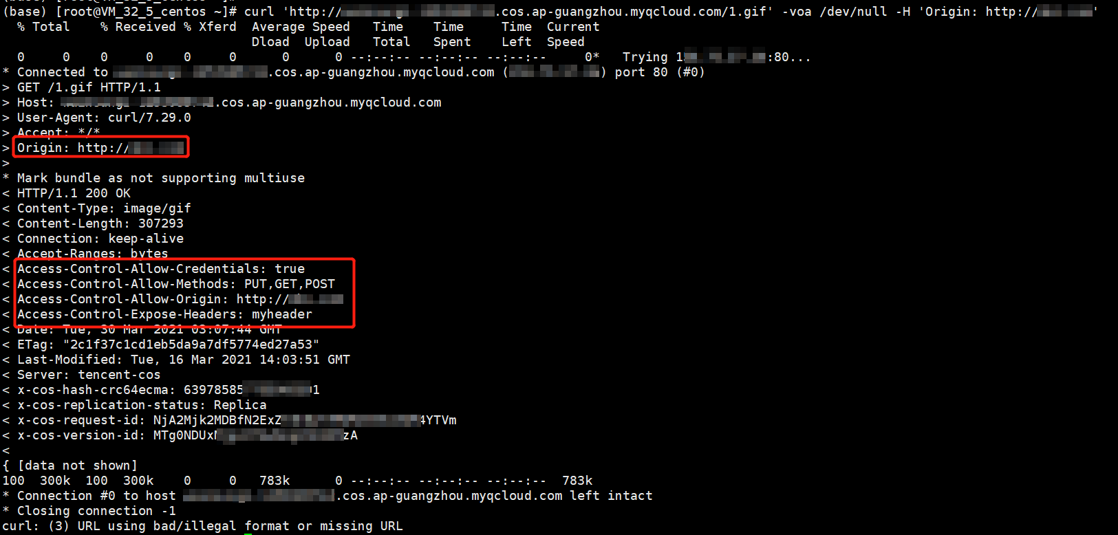 curl 'http://bucket-appid.cos.ap-guangzhou.myqcloud.com/object' -voa /dev/null -H 'Origin: クロスドメインアクセスCORS設定のソースOrigin'