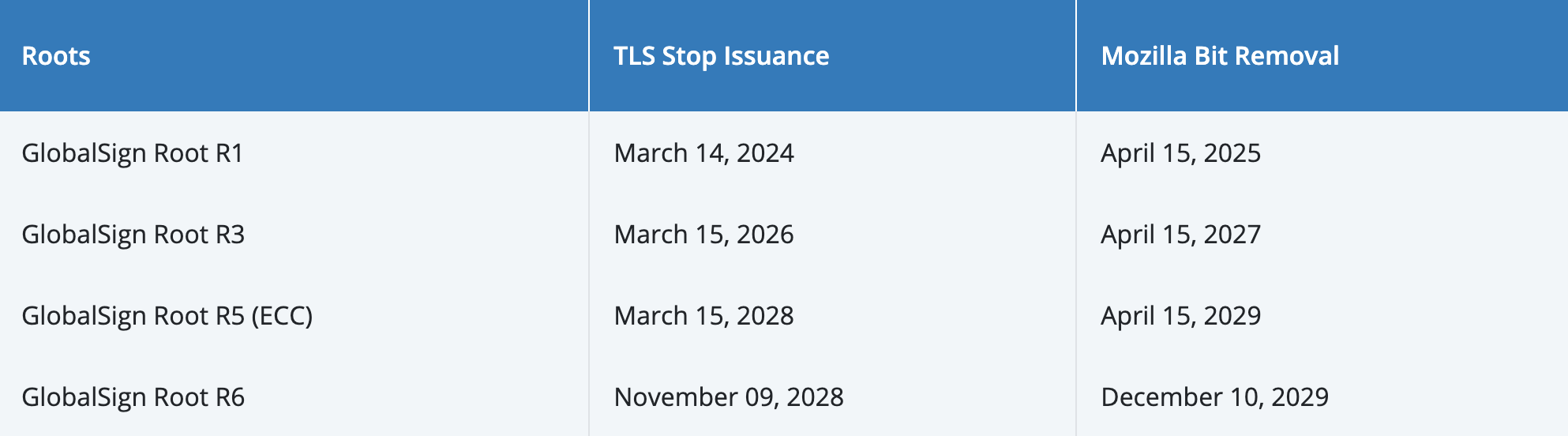 As a result, GlobalSign certificate authority will gradually discontinue issuing TLS/SSL certificates using the old root system (R1) and begin using the new root system (R3) to issue TLS/SSL certificates, to ensure that TLS/SSL certificates continue to be trusted in Firefox browsers. For details, please refer to the official announcement. Notice